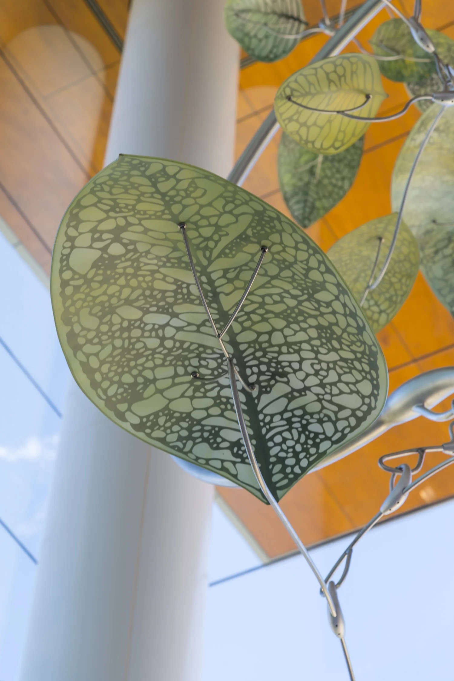 These four sculptures reflect the natural environment of the Lidcombe area. Butterfly wings, banksia leaves and a fishing tree representative of the original peoples who inhabited the area. The colours are those of the bushland in this part of New South Wales and combined with the planting , create a peaceful and reflective oasis in the building .